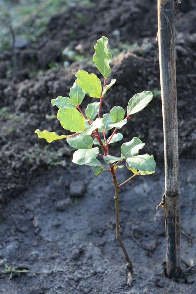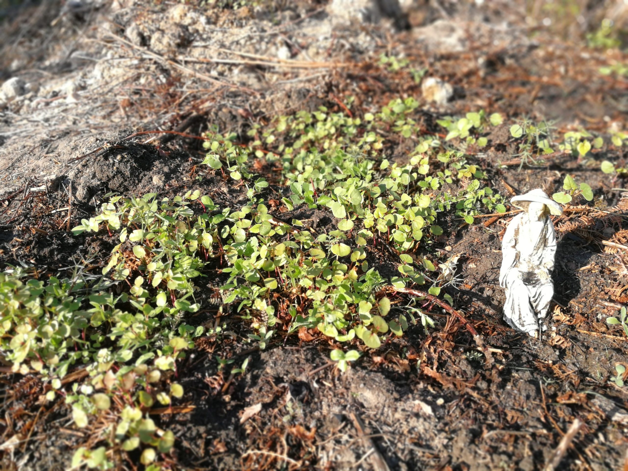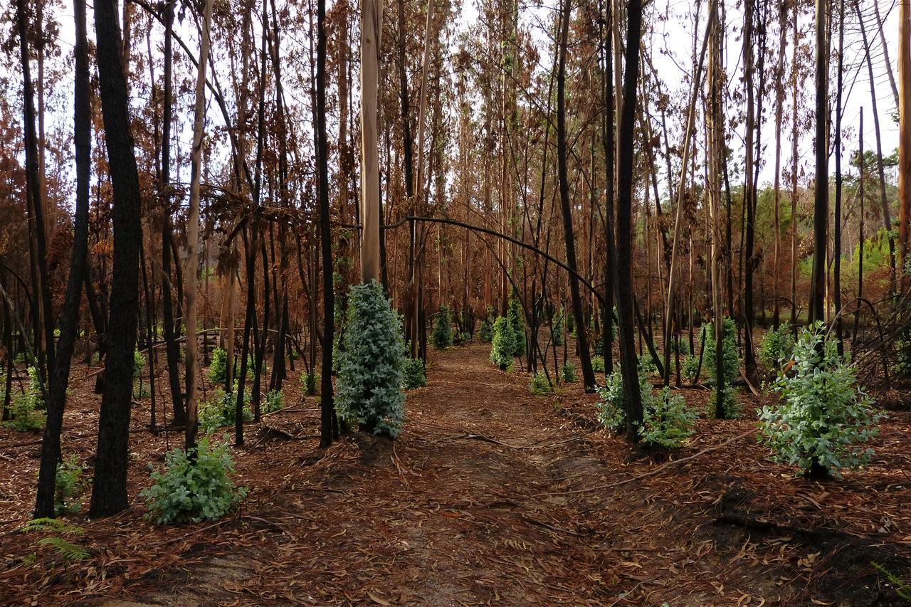 Foram plantadas até agora cerca de 45 árvores. As árvores de fruto misturam-se com as árvores da floresta. E assim, já crescem, alfarrobeiras, castanheiros, no-gueiras, figueira, sabugueiro, romanzeira, pessegueiro, amei- xoeira, cedro, cerejeiras, abacateiros, limoeiro, laranjeira, gingko-biloba, freixo, azinheira, medronheiro,sobreiro, nesperei- ra, amendoeira, pinheiros e diospireiro. E entretanto, juntam-se a elas os carvalhos que nascem de bolotas que resistiram ao fogo e com que força! Dezembro 2020